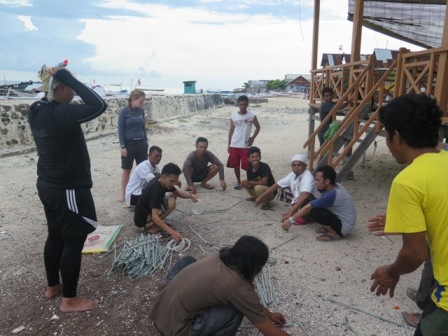 lemsa dwas doing a reefs transplantation project at pulau kodingareng, makassarKegiatan transplantasi karang yang dilakukan bukan sekedar menargetkan bagaimana rehabilitasi dilakukan, tetapi juga bagaimana upaya tersebut dipahami oleh komunitas. Prinsip ini menjadi penting karena sebesar apapun upaya yang dilakukan tanpa dukungan komunitas maka resiko kegagalan semakin membesar. Tak kenal maka tak sayang, jika tak mengenal tujuan dan metode maka jangan harap dukungan dari komunitas akan diperoleh.